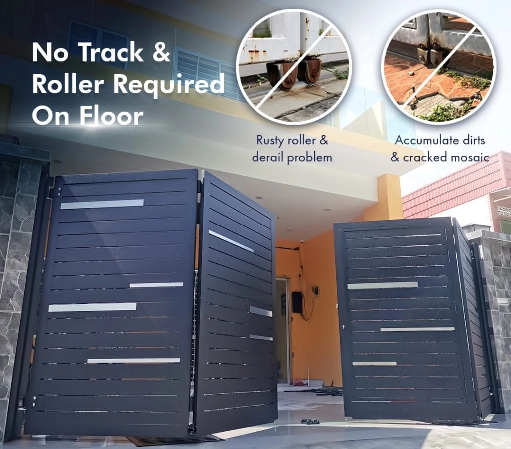 The traditional folding gate typically comes with the roller and track inconvenience, where sand gets stuck in between and the roller runs out from the gate and track.
