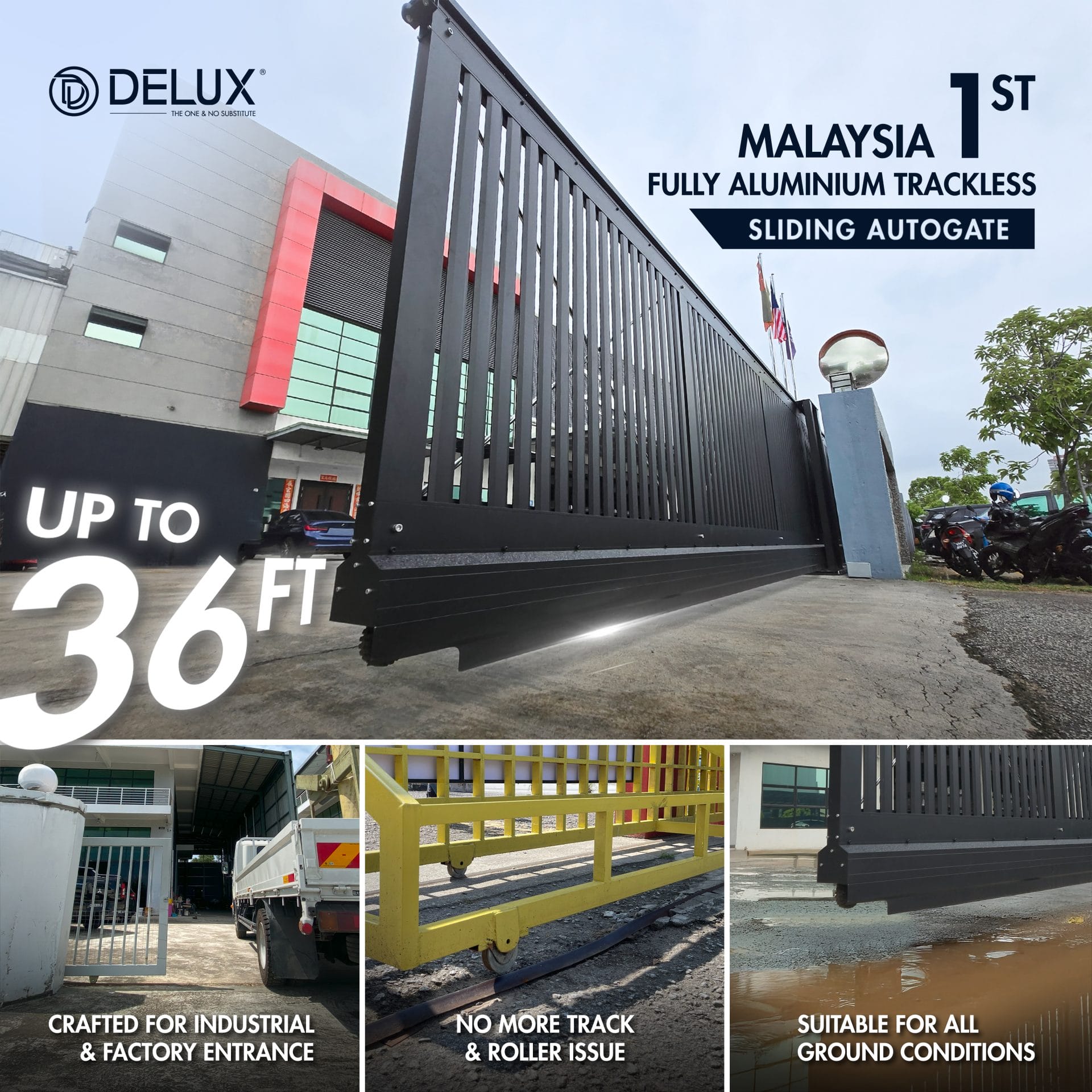 On 27 August 2025, DELUX is proud to unveil a groundbreaking innovation in the autogate industry – the UniGate Slide, Malaysia’s first fully aluminium trackless sliding autogate designed exclusively for commercial use.