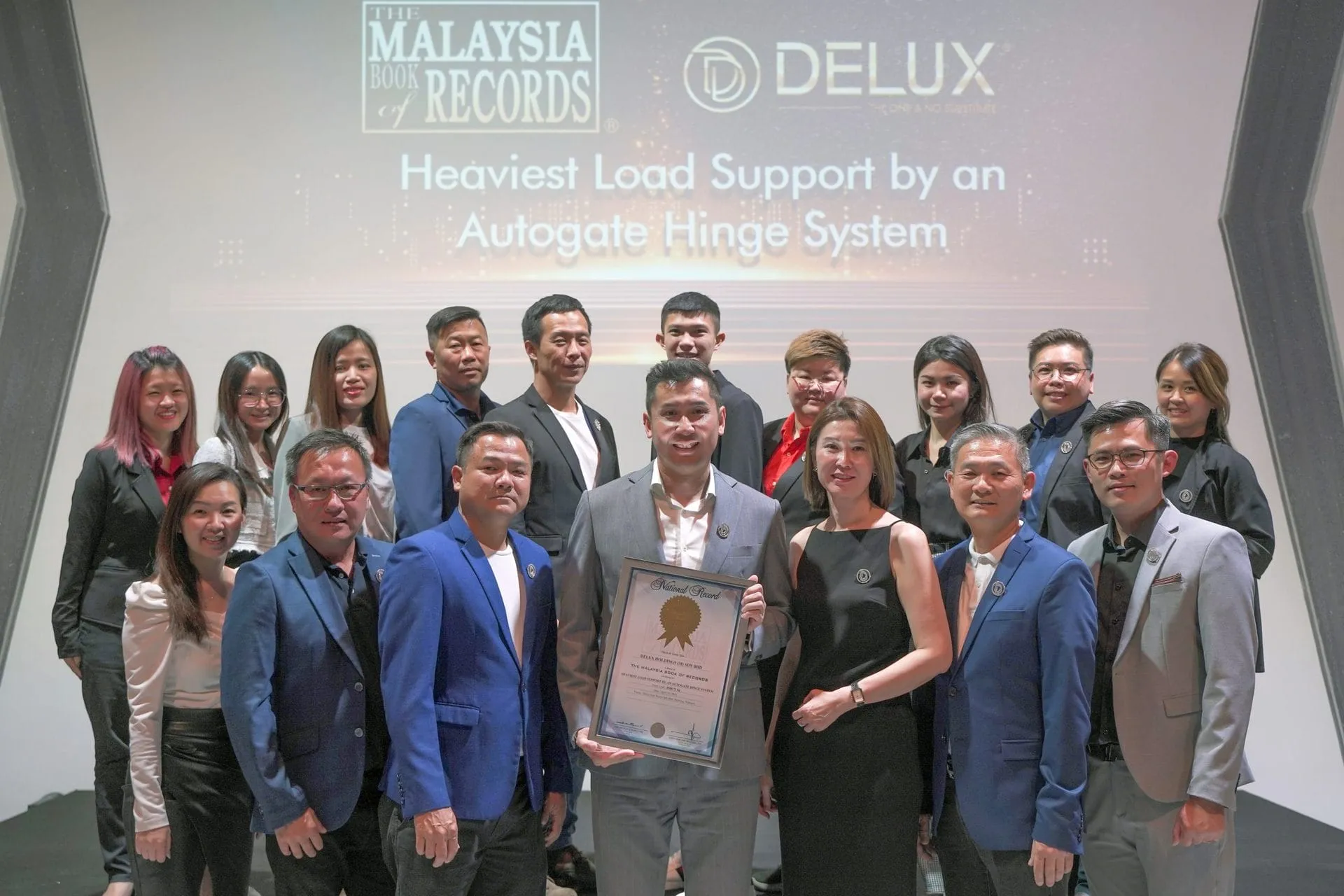 We are thrilled to congratulate DELUX Holdings (M) Sdn. Bhd. on their latest accomplishment – breaking the “Heaviest Load Support by an Autogate Hinge System” record in the Malaysia Book of Records. SIRIM, the official certification body, has certified an impressive total test load of 4588.72kg, setting a new standard for other companies to aspire to in terms of certification and record-breaking.