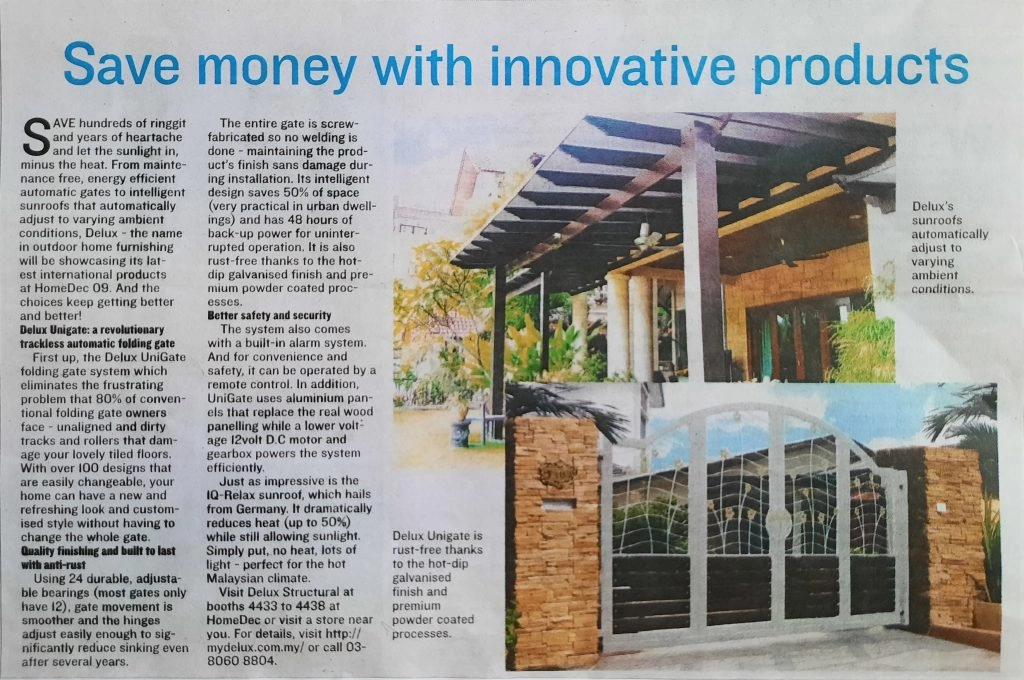 Save hundreds of ringgit and years of heartache and let the sunlight in, minus the heat. From maintenance free, energy efficient automatic gates to intelligent sunroofs that automatically adjust to varying ambient conditions, DELUX – the name in outdoor home furnishing will be showcasing its latest international products at HomeDec 09. And the choices keep getting better and better!